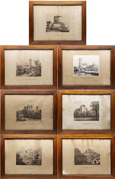 Da F. Gonin. Gruppo di sette litografie raffiguranti i castelli piemontesi. Secolo XIX. In cornici coeve (cm 44x58) (difetti)