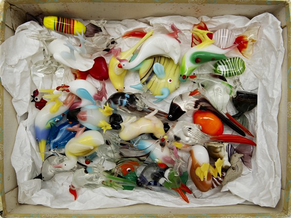 Manifatture differenti, tra cui Nymphenburg. Cartone contenente diverse figure di animali in ceramica e vetro policromo (cm max 30x17) (difetti)
