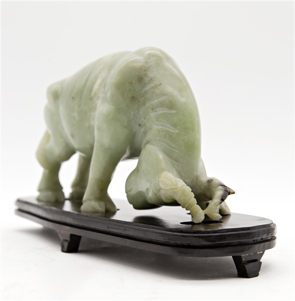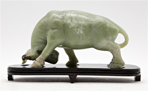 Lotto 390 | Bufalo d'acqua in pietra dura verde (cm 20x5x9,5) Poggiante su base lignea sago