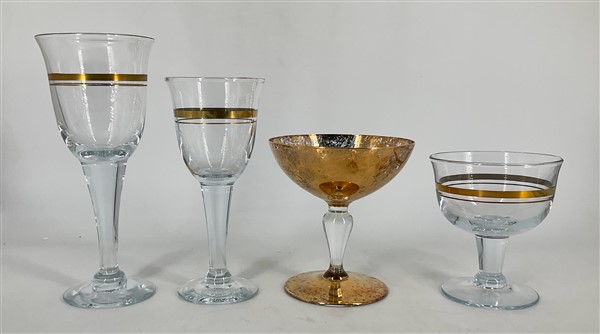 Manifattura Holme Gaard, Copenaghen. Parte di servizio di bicchieri in vetro profilati in oro unito ad altri bicchieri di manifattura diversa. In quattro cartoni (difetti)