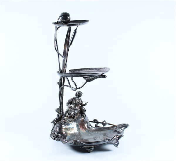 Centrotavola Liberty in metallo argentato con struttura di impianto naturalistico su tre ordini, decorata alla base da figura femminile allegorica con putto assisi su vasca con pesci a rilievo, fusto a steli con foglie di ninfea. Poggiante su piedi a lumachine a tutto tondo (h cm 54) (difetti e rotture)
