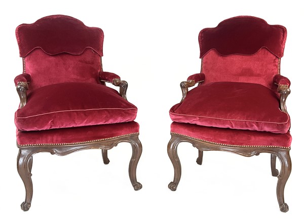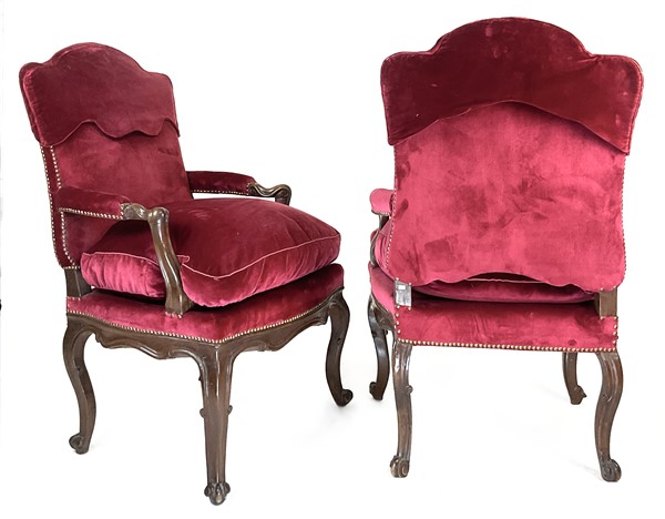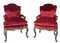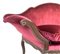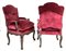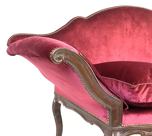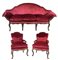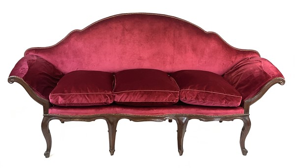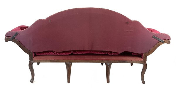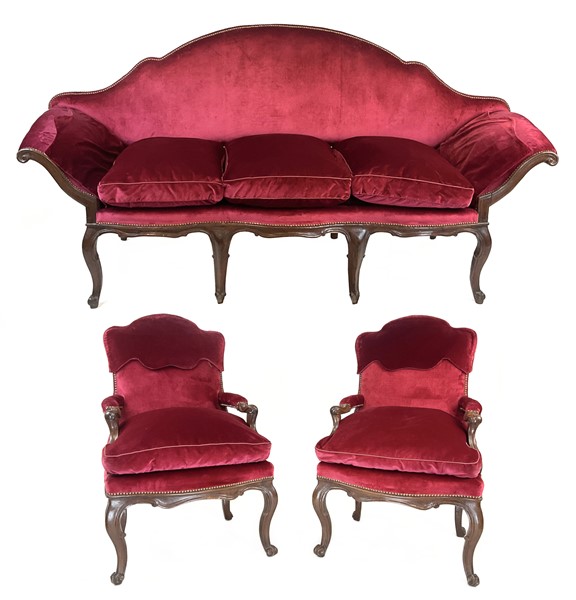 Fornitura da salotto in noce composta da un divano a ventaglio e coppia di poltrone rivestite in velluto rosso, gambe mosse terminanti a ricciolo (l max cm 246) (difetti)
