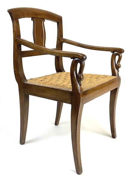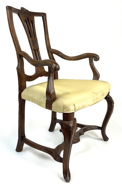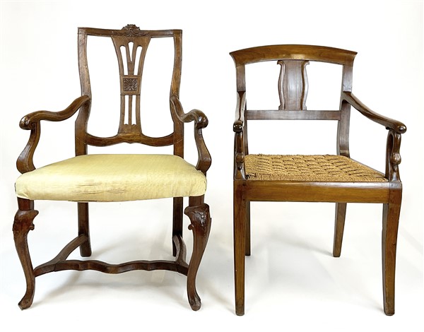Lotto composto da due diverse poltrone in noce, una con braccioli e gambe mosse riunite da traverse e una con braccioli retti da collo di cigno. Secolo XIX (difetti)