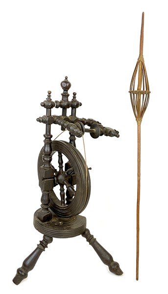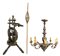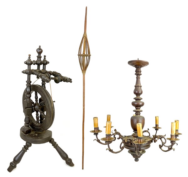 Lotto composto da un lampadario a otto luci con struttura in legno tornito e bracci a volute in metallo (h cm 70) ed un arcolaio (gravi difetti e mancanze)