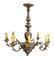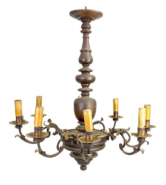 Lotto composto da un lampadario a otto luci con struttura in legno tornito e br