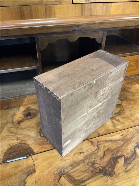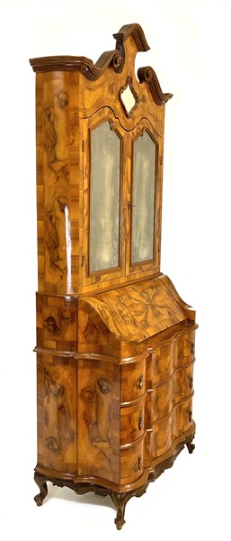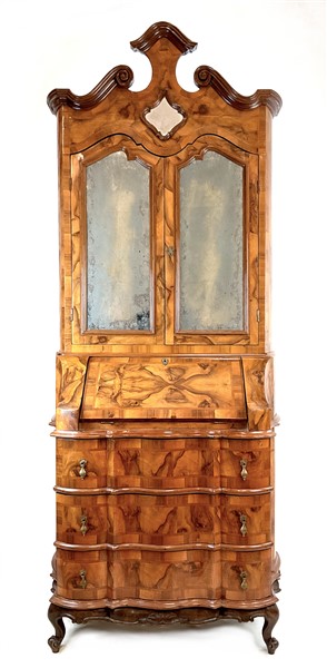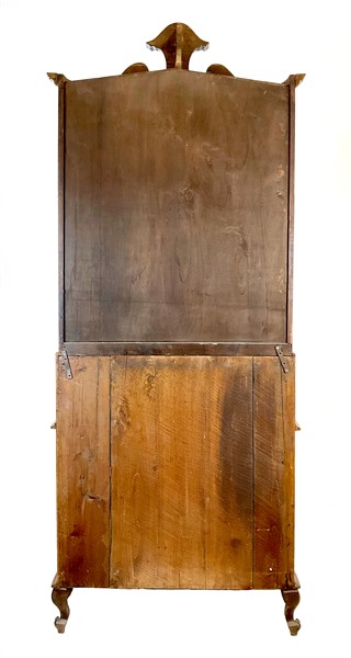 Trumeau in stile veneto settecentesco impiallacciato in radica di noce, parte inferiore a tre cassetti e calatoia, parte superiore a due ante specchiate (cm 91x222x50) (difetti)