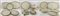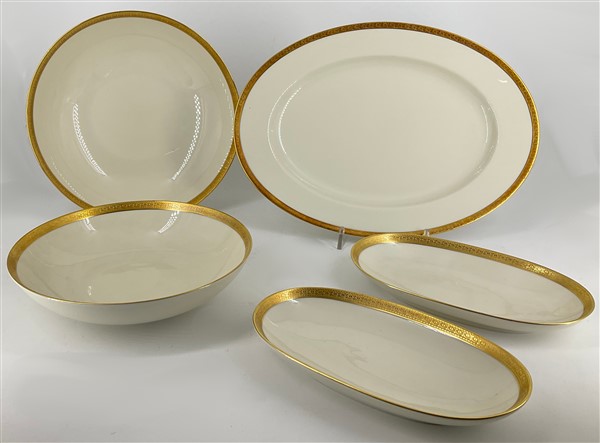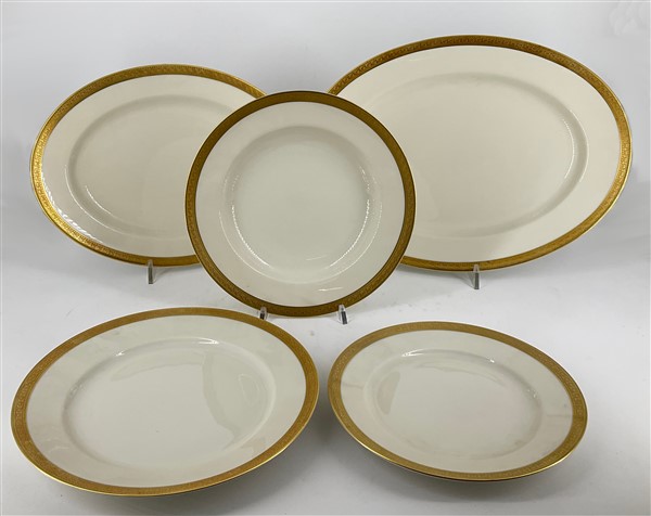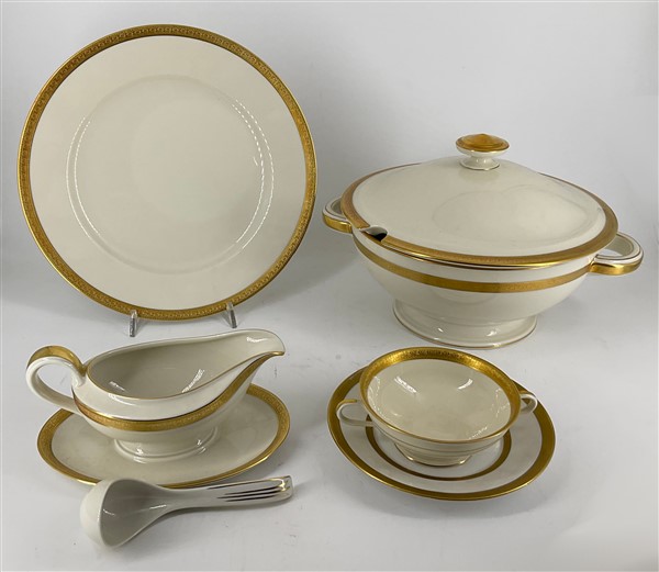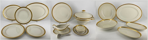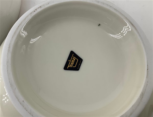 Manifattura Thomas, Germania. Servizio da tavola in porcellana con bordura in oro composto da trentasei piatti piani, dodici fondine, dodici piatti da frutta, dodici tazze biansate da brodo con piatto, una zuppiera con coperchio, una salsiera con mestolo e nove diversi piatti da portata. (difetti)