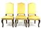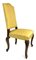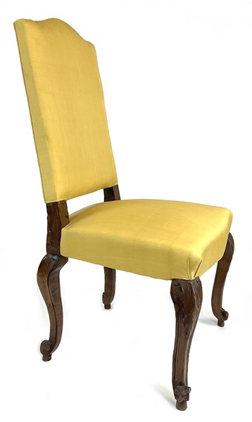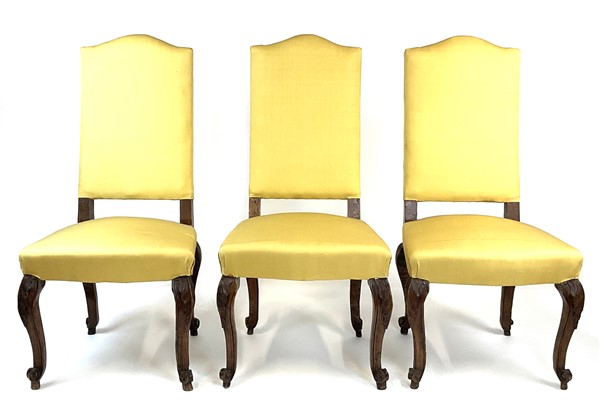 Tre sedie in noce con gambe mosse terminanti a ricciolo, seduta e schienale rivestita in tessuto giallo (difetti)