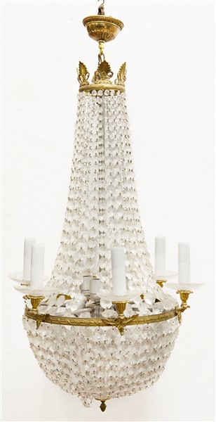 Lampadario a mongolfiera con sei luci in metallo dorato raccordato da catenelle e pendenti in vetro sfaccettato (h cm 108 circa) (difetti)