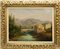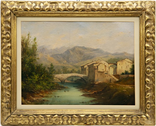 Ignoto del secolo XX "Scorcio fluviale con ponte e borgo" olio su cartoncino