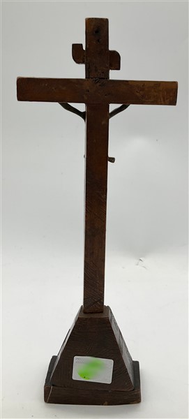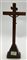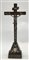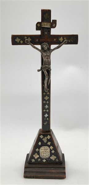 Crocifisso da appoggio in metallo su croce in legno intarsiato in madreperla, secolo XIX (h. cm 26) (difetti e restauri)