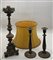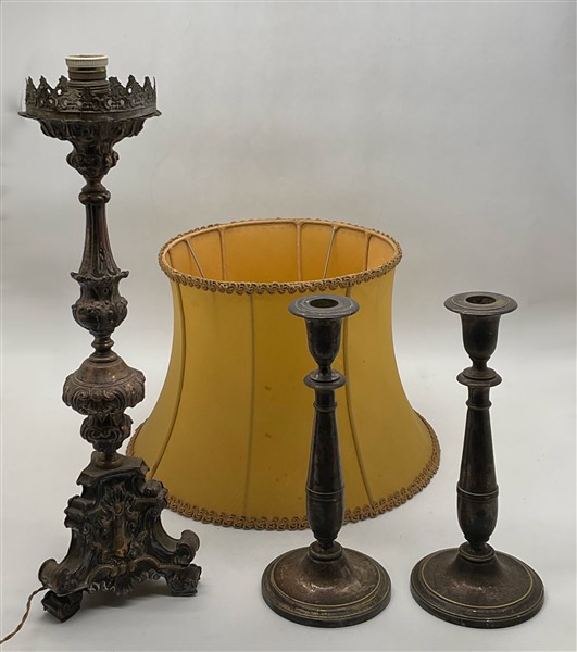 Lotto composto da una coppia di candelieri in metallo argentato a corpo liscio ed un antico candeliere in metallo sbalzato e argentato (h max cm 53) adattato a lampada con paralume in epoca successiva (difetti)