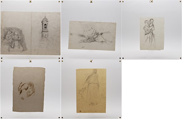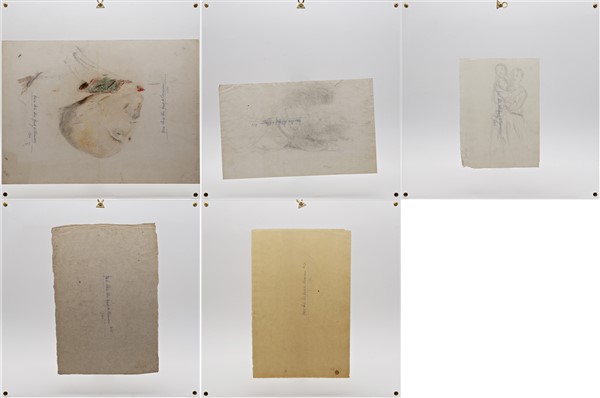 Scuola del secolo XIX, Lotto composto da cinque tecniche miste su carta raffiguranti "Studi" (cm. max. 50 x 36) al retro iscritti e uno anche disegnato 24, 20, 17, 21, 16