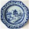 Due piatti ottagonali e un boccale in porcellana bianca e blu, decorati con motivi di paesaggio