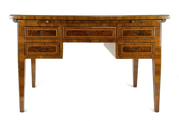 Scrittoio da centro lastronato in noce e filettato in legni vari, fronte a cinque diversi cassetti, piano scorrevole e piano di scrittura estraibile con riserva in pelle. Secolo XIX (cm 123x79x66) (difetti)