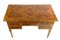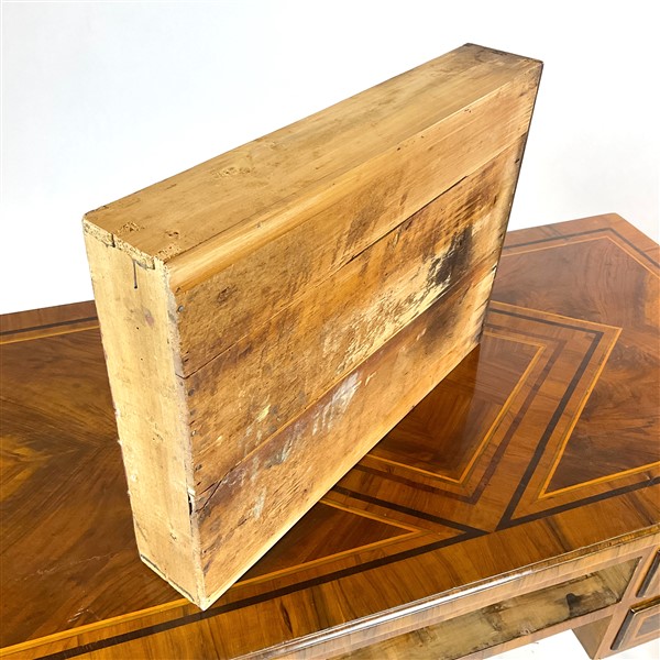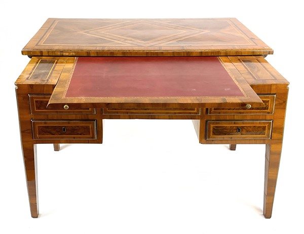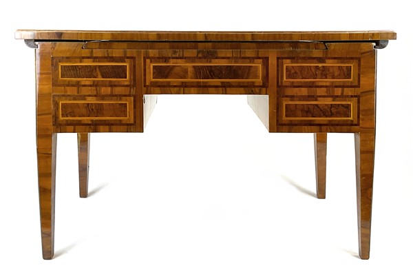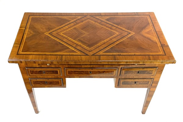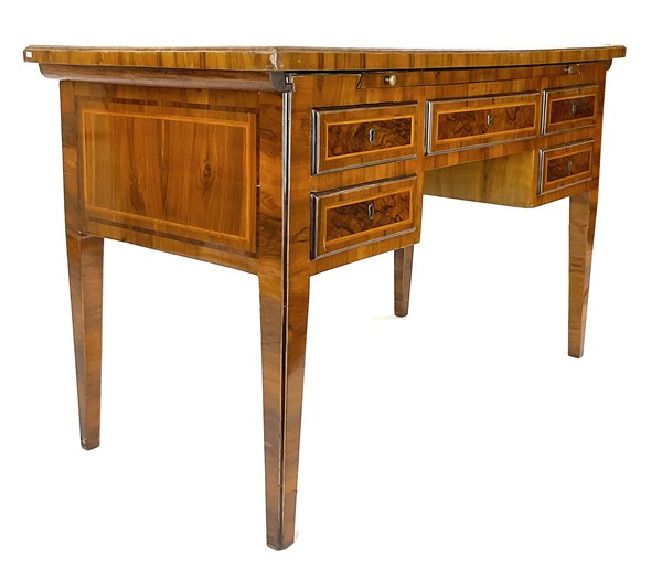 Scrittoio da centro lastronato in noce e filettato in legni vari, fronte a cinq