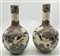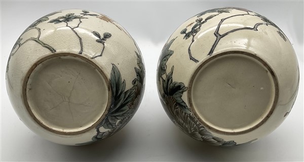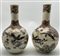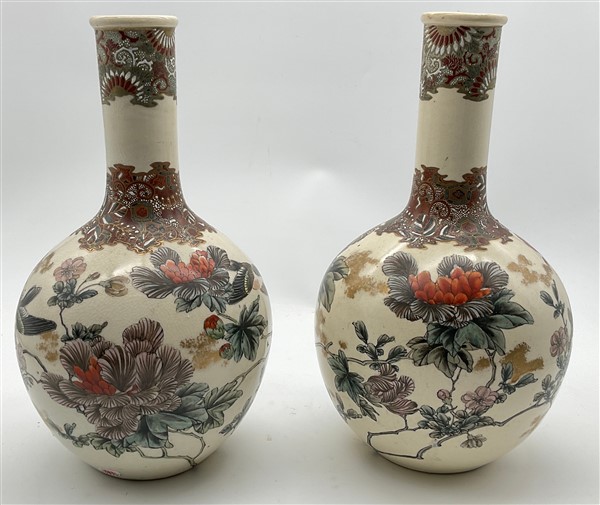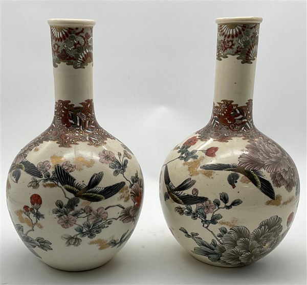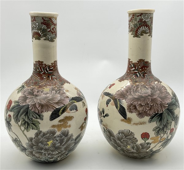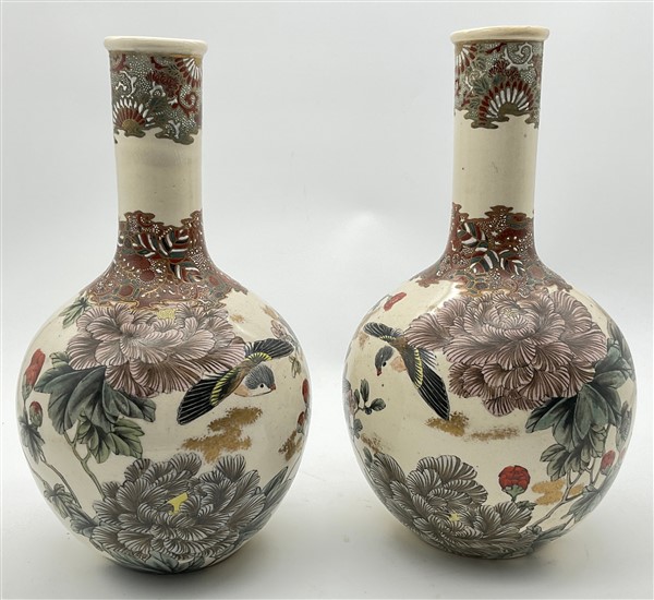 Coppia di vasi a bottiglia in porcellana policroma decorata a grandi fiori e volatili. Giappone, secolo XX (h cm 32) (difetti)