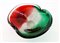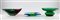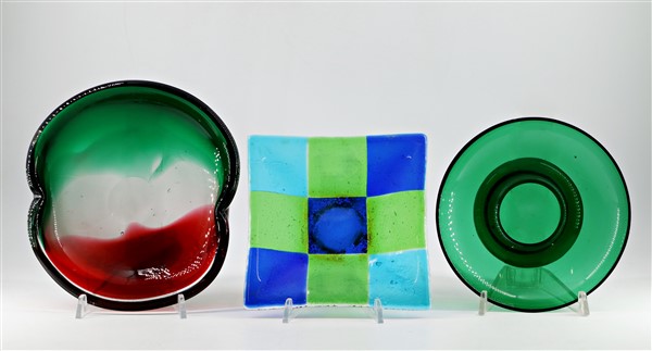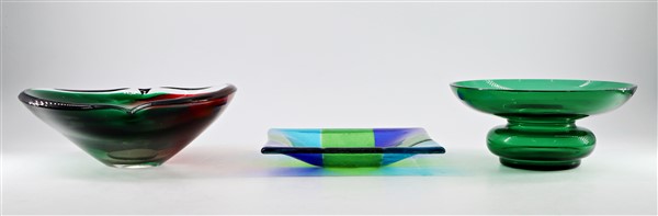 Lotto composto da una coppetta in vetro trasparente verde, una portaoggetti in vetro trasparente blu, azzurro e verde uniti a un centrotavola in vetro trasparente incolore, rosso e verde. Secolo XX. (misure diverse) (lievi difetti)