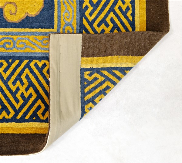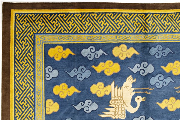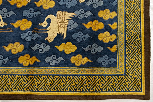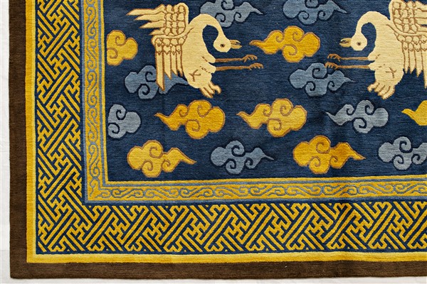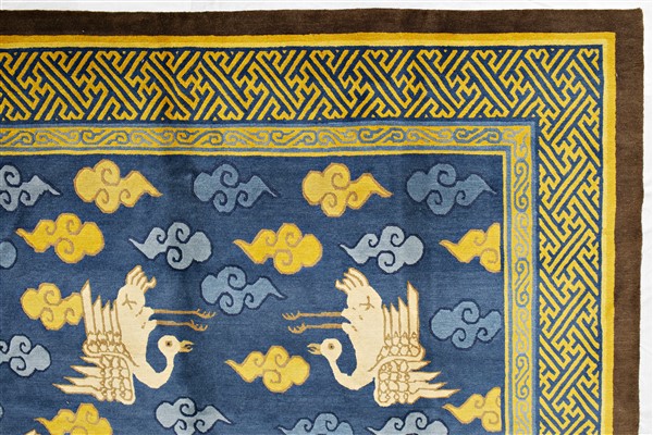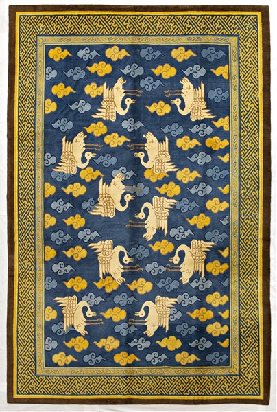 Tappeto Nepal, recente manifattura. Decoro con gru in volo nei toni del beige e nocciola cosparso di nuvole gialle e azzurre su fondo blu (cm 329x219) (difetti)