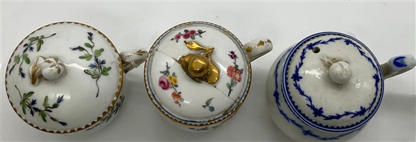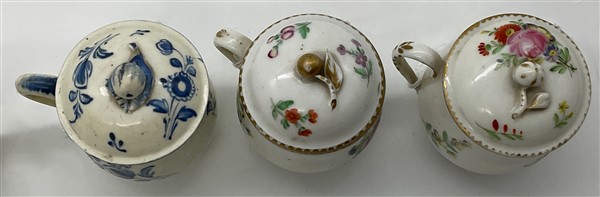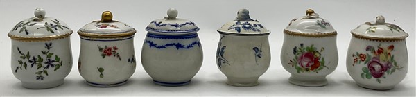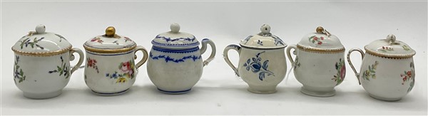 Manifatture diverse, secolo XVIII-XIX. Lotto composto da sei diverse cremiere con coperchio in porcellana decorata in policromia a fiori (difetti e restauri)