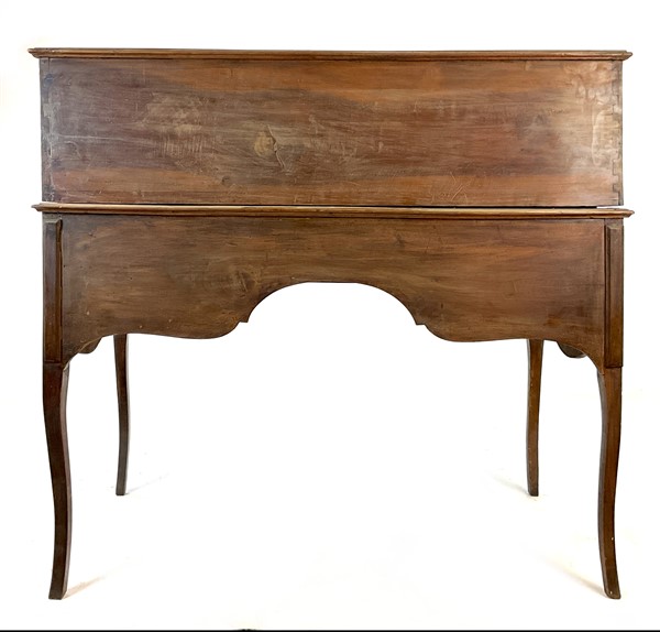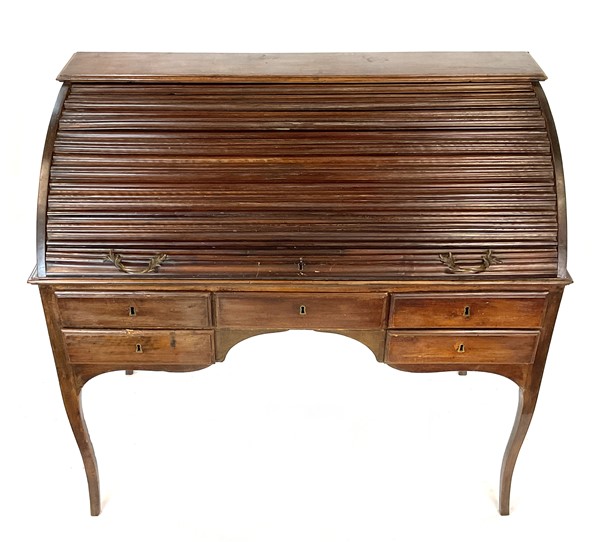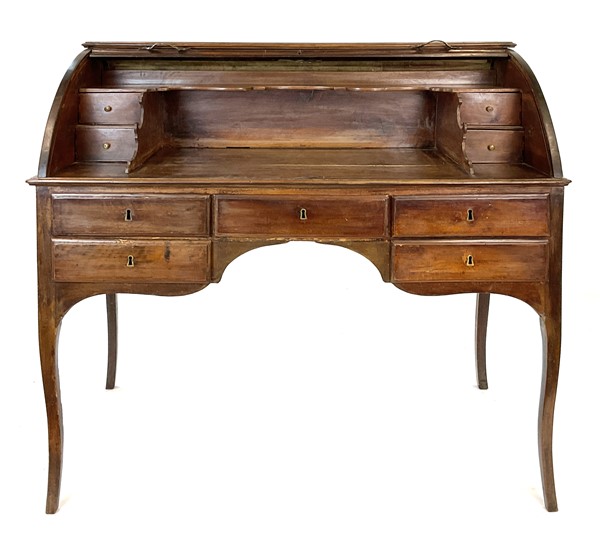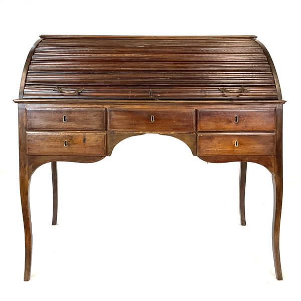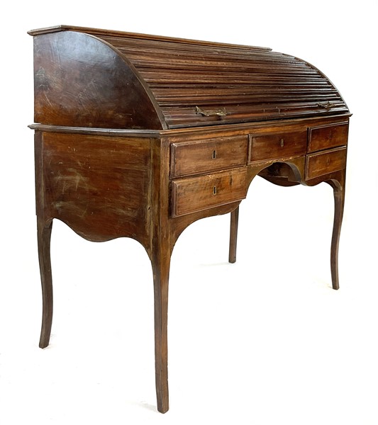Scrittoio a rullo con serrandina celante quattro tiretti e vani a giorno. Fronte a cinque cassetti, gambe mosse. Secolo XVIII (cm 47x112x63) (difetti, restauri e mancanze)
