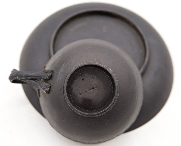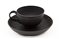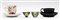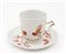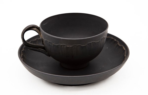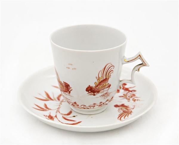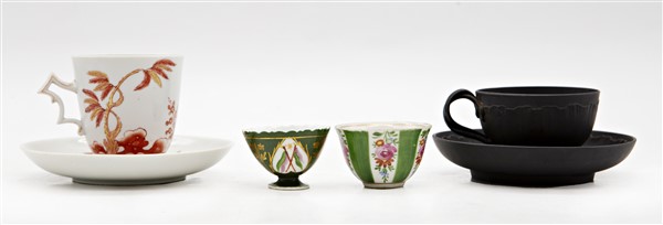 Manifatture diverse, secolo XVIII-XIX. Lotto composto da una tazza con piatto in porcellana dipinta in monocromo rosso e oro con motivo "al galletto" (Ginori); una tazza con piatto in black basalt (Wedgwood) e due piccole chicchere di manifatture differenti (difetti)