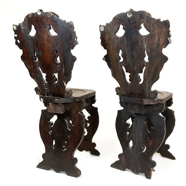 Coppia di sgabelli in noce intagliato e traforato con schienale e sostegno ante