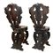 Coppia di sgabelli in noce intagliato e traforato con schienale e sostegno anteriore decorati da figure alate reggenti scudo, cimasa a volute contrapposte. Inizio secolo XX. (h cm 101) (difetti e restauri)