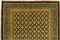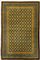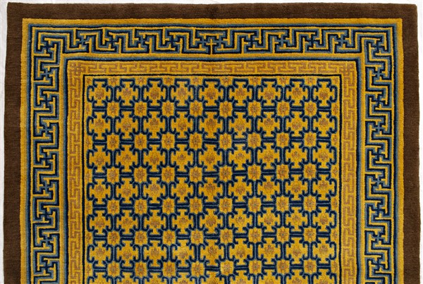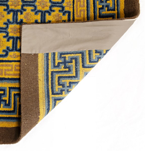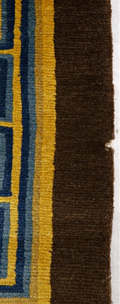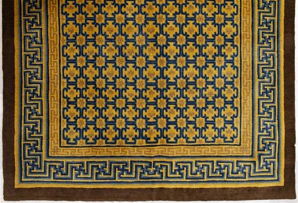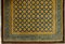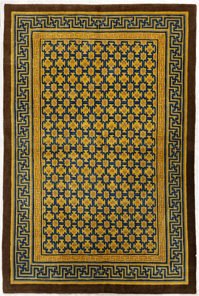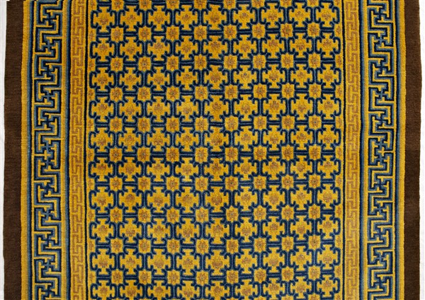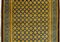 Tappeto Nepal, recente manifattura. Decoro a griglia nei toni dell'azzurro, blu e volatili con stelle e pipistrelli su fondo giallo (cm 183x144) (difetti)