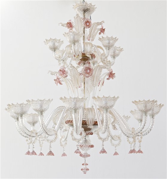 Manifattura di Murano. Grande lampadario a diciotto luci in vetro incolore e rosa con bracci a voluta ritorta e decori a foglie e fiori (h cm 130, d cm 110 ca.) (difetti)