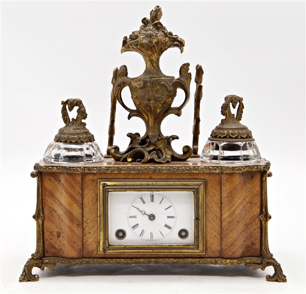 Lotto 531 | Pendoletta da scrivania con calamaio. Cassa di forma mossa in bois de rose e m