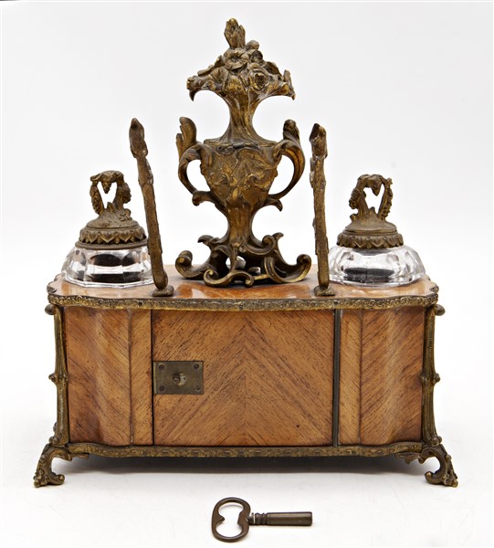 Cassa di forma mossa in bois de rose e metallo dorato. Nella parte superiore è presente il set da scrittura formato da due ampolle, una coppetta ed il porta piuma.