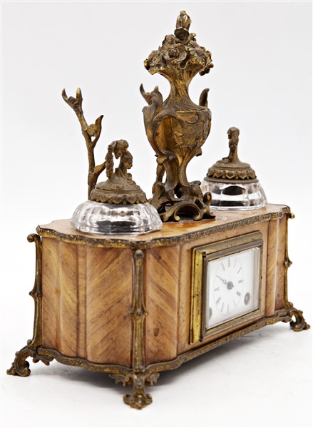 Pendoletta da scrivania con calamaio. Cassa di forma mossa in bois de rose e m