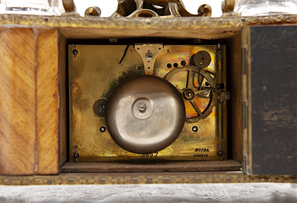 Quadrante in smalto bianco a numeri romani, movimento a due treni con suoneria delle ore e mezze su campanello, meccanismo firmato "Moser a Paris"