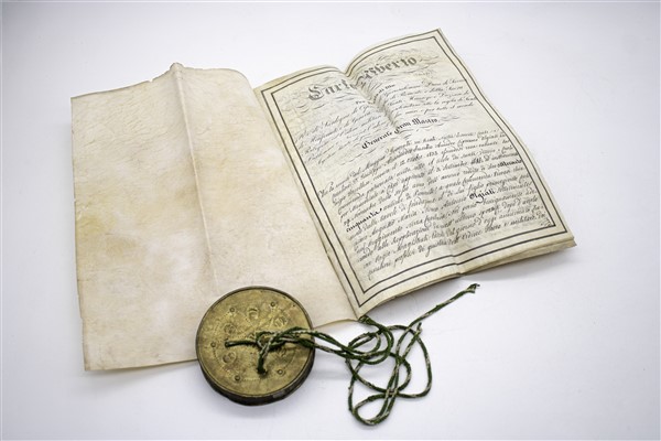 Due patenti manoscritte di Carlo Alberto, re di Sardegna, rispettivamente del 1833 e 1834, su pergamena, con sigilli in ceralacca nera, in custodia con coperchio (difetti)