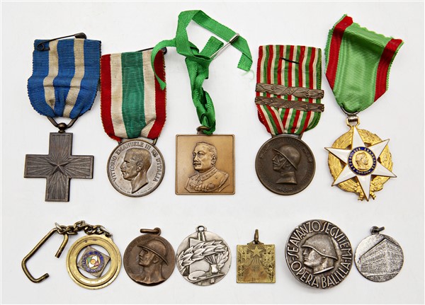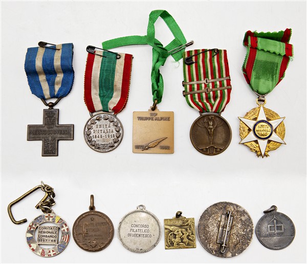 Lotto eterogeneo di medaglie e onorificenze tra cui: Ordine al Merito Agricolo della Repubblica Francese con medaglia dorata e smaltata con nastro verde con striscia rossa per parte; Croce al Merito di Guerra del Regno d'Italia Vittorio Emanuele III; Medaglia commemorativa per i 50 anni dell'Unità d'Italia 1848-1918 dell'Associazione Nazionale Madri e Vedove dei caduti, spilla del Ventennio fascista in metallo dell'Opera Nazionale Balilla con motto "se avanzo seguitemi"; medaglia militare per il 110° anniversario delle Truppe Alpine 1872/1982 (difetti e mancanze)