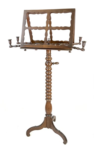 Leggio tripode con sostegno tornito in legno filettato e decorato a foglie e motivi geometrici stilizzati, dotato di quattro portacandela. Inscritto ad intarsio sul fronte "Cerioni". Secolo XIX (h cm 140) (difetti)