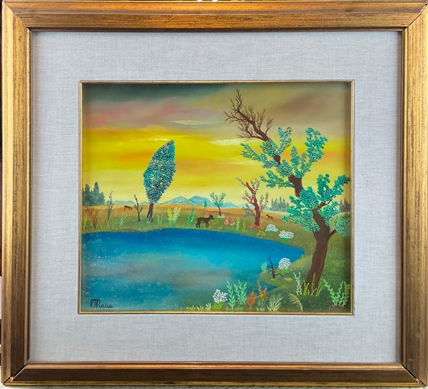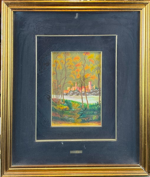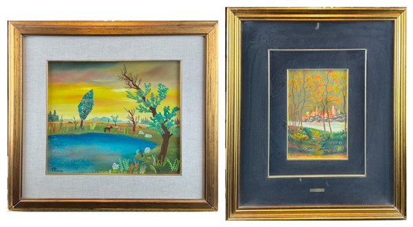 Lotto composto da due tecniche miste su masonite raffiguranti paesaggi, di autori e misure diverse (misura max cm 29x33,5) firmati in basso, uno firmato e titolato al retro con etichetta della Galleria Salotto dell'Arte, Milano