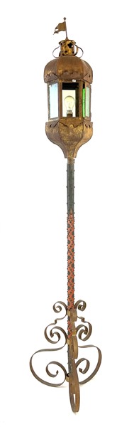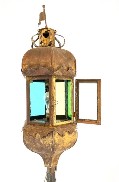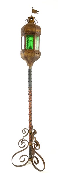 Lotto 545 | Antico cilostro in lamierino dorato con vetri policromi, base tripode in ferro