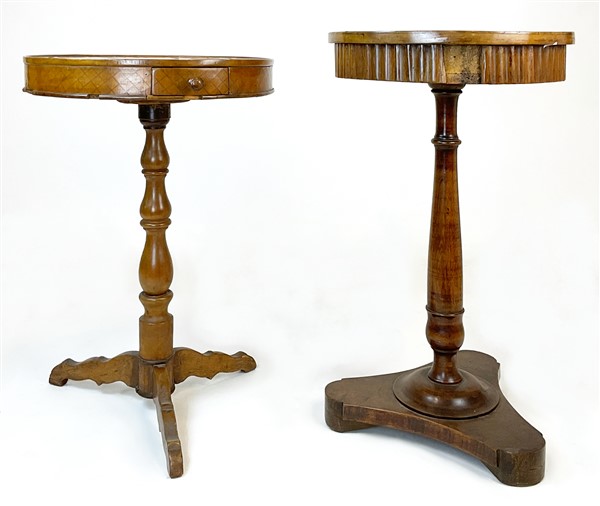 Due diversi tavolini di cui uno con piano intarsiato a stella ed un cassetto nella fascia e uno in ciliegio profilato a dentellature, fusto tornito poggiante su base tripode (cm max h. 78: d. 46) (difetti e mancanze)
