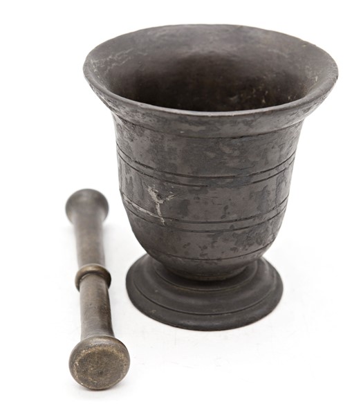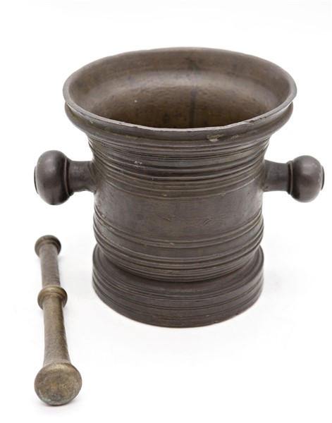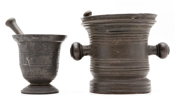 Lotto 560 | Lotto di due antichi mortai in bronzo con pestelli di cui uno biansato e scanal