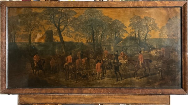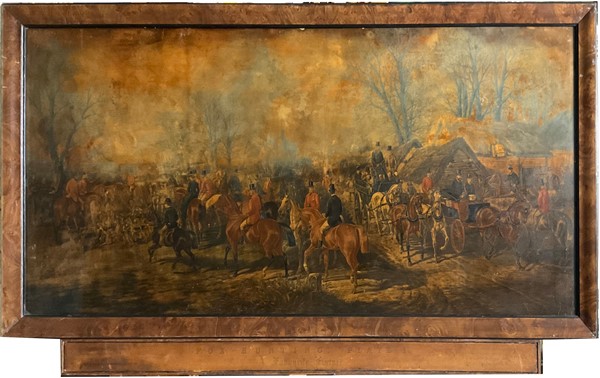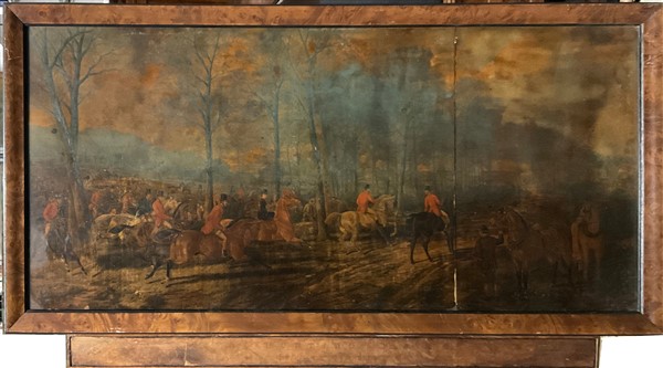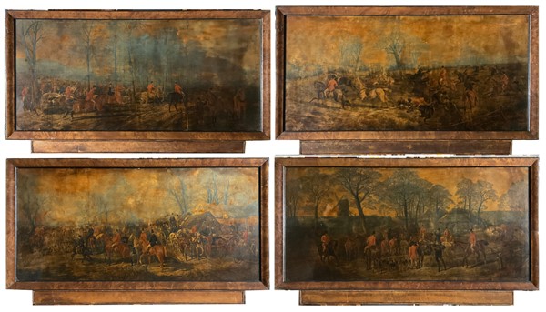 Lotto composto da quattro grandi stampe inglesi della fine del secolo XIX raffiguranti "Scene di caccia", riprese ad acquerello e verniciate