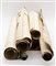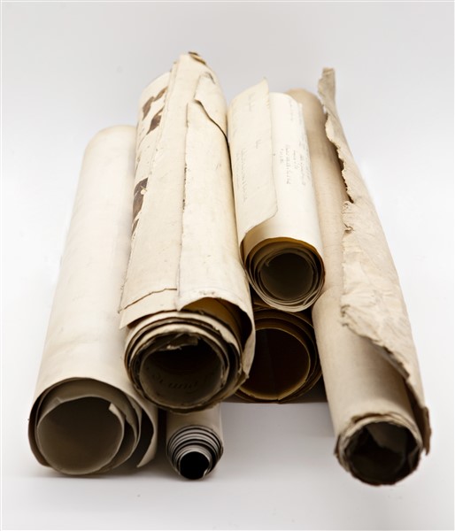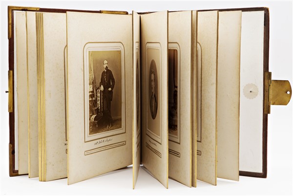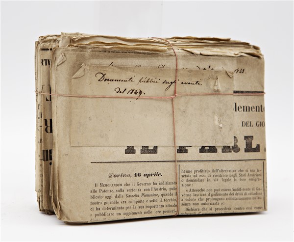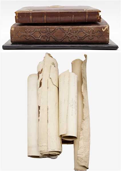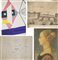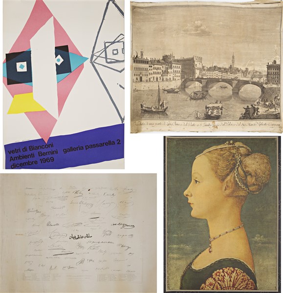 Cartone contenente antiche incisioni, poster, album con foto d'epoca e oggetti