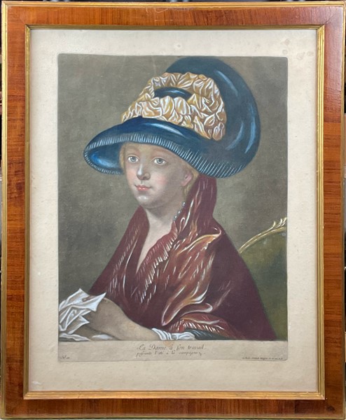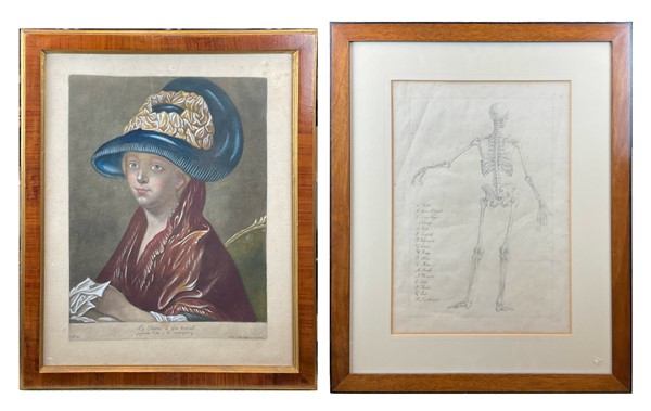 Lotto composto da un disegno anatomico a penna di un artista anonimo del secolo XIX (al visibile mm 385x270) e un'acquaforte a mezzatinta raffigurante "La Dame à son travail" incisa da Heiss (mm 432x318 l'impronta)