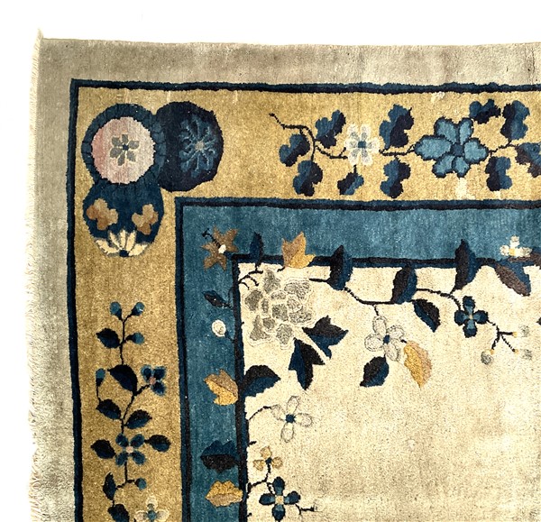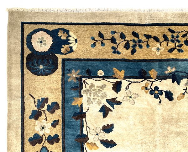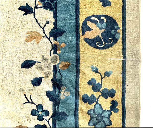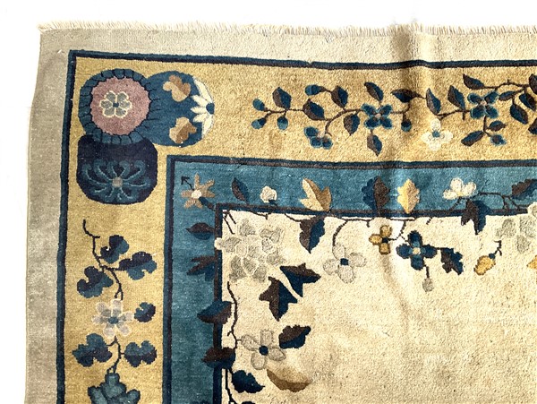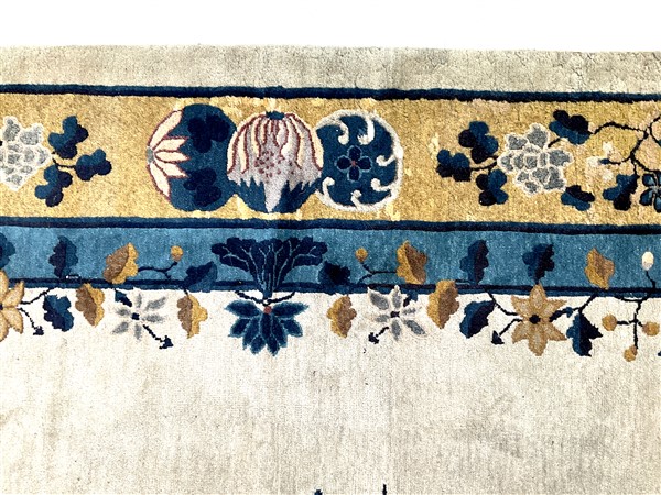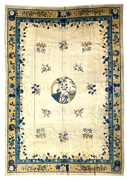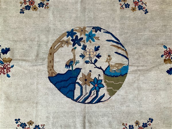 Tappeto Decò, Cina, inizio secolo XX. Decoro con medaglione tondeggiante con rocce ed alberifiorti con cervo e gru. Campo color bianco cosparso di rami fioriti, bordura a fondo giallo con motivi taoisti e floreali (cm 442x340) (difetti e rapature)