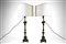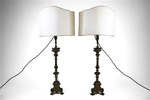 Coppia di portaceri tripodi in bronzo, secolo XVIII (h cm 61). Adattati a lampada in epoca successiva con paralumi (h cm tot 84) (difetti e restauri)