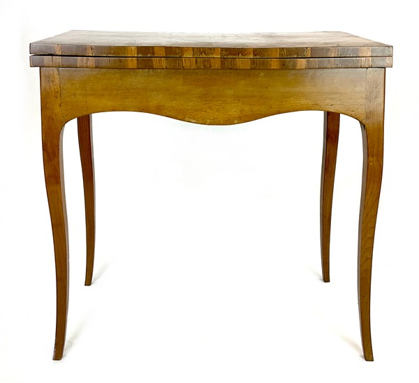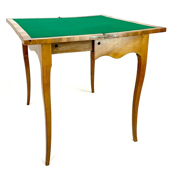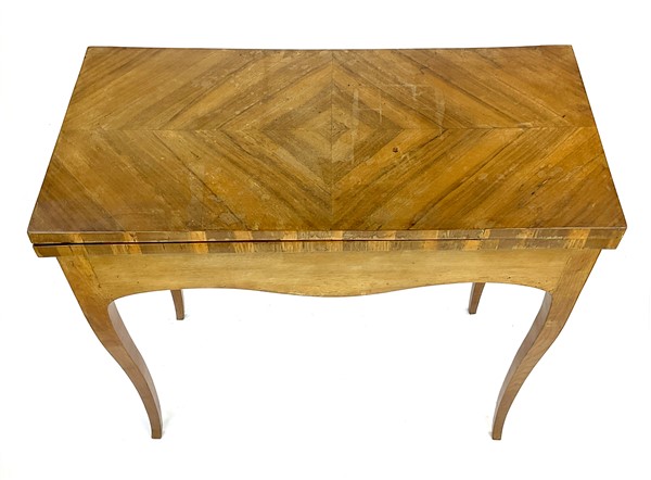Tavolino da gioco con piano a libro lastronato con alte gambe mosse, interno con riserva in panno verde. Secolo XIX (chiuso: cm 74,5x72,5x36,7) (difetti e restauri)