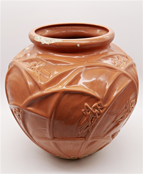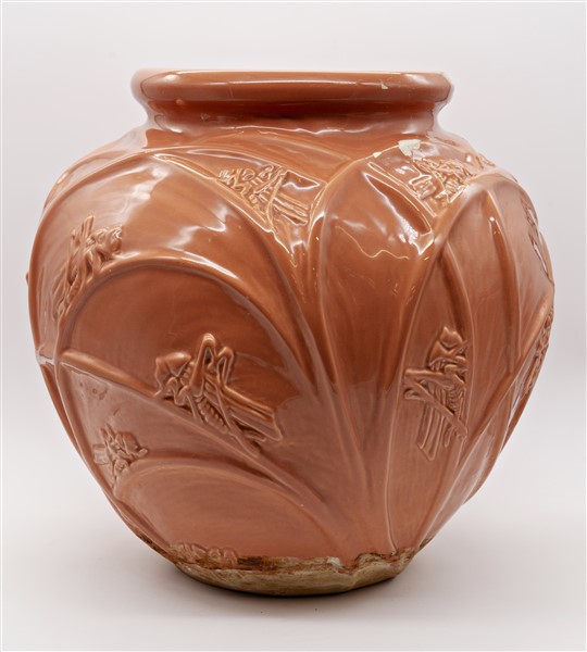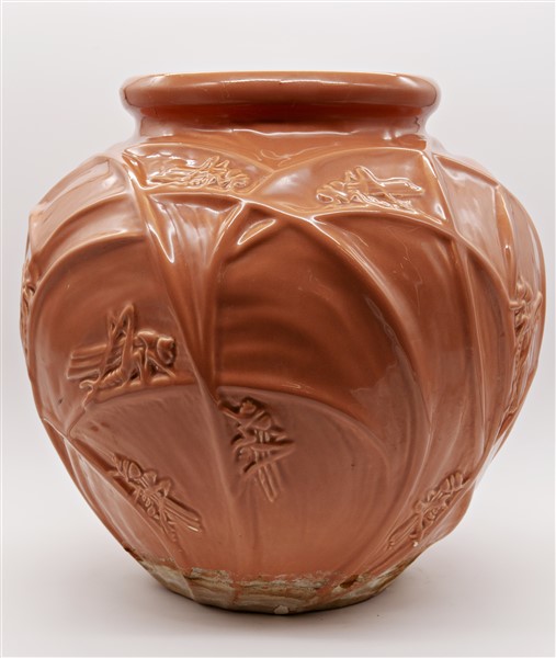 Vaso in ceramica smaltata nei toni del rosa con decoro a rilievo di cavallette su foglie da un modello del vaso "Sauterelle" di Lalique (h cm 43; d cm 43) (difetti)