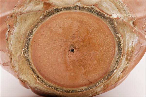 Vaso in ceramica smaltata nei toni del rosa con decoro a rilievo di cavallette