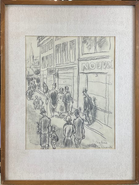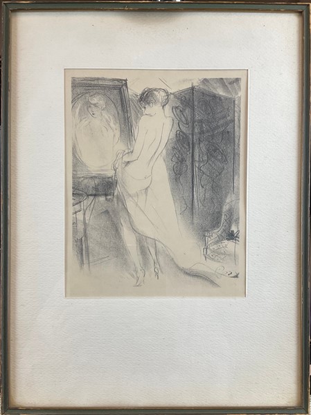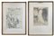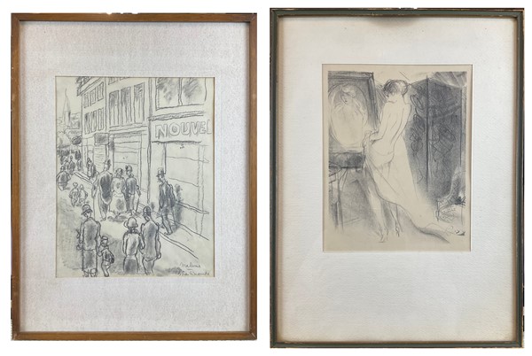 Lotto composto da un disegno su carta firmato ed iscritto e una riproduzione a stampa raffiguranti rispettivamente "Veduta parigina" e "Figura allo specchio" In cornici (difetti)